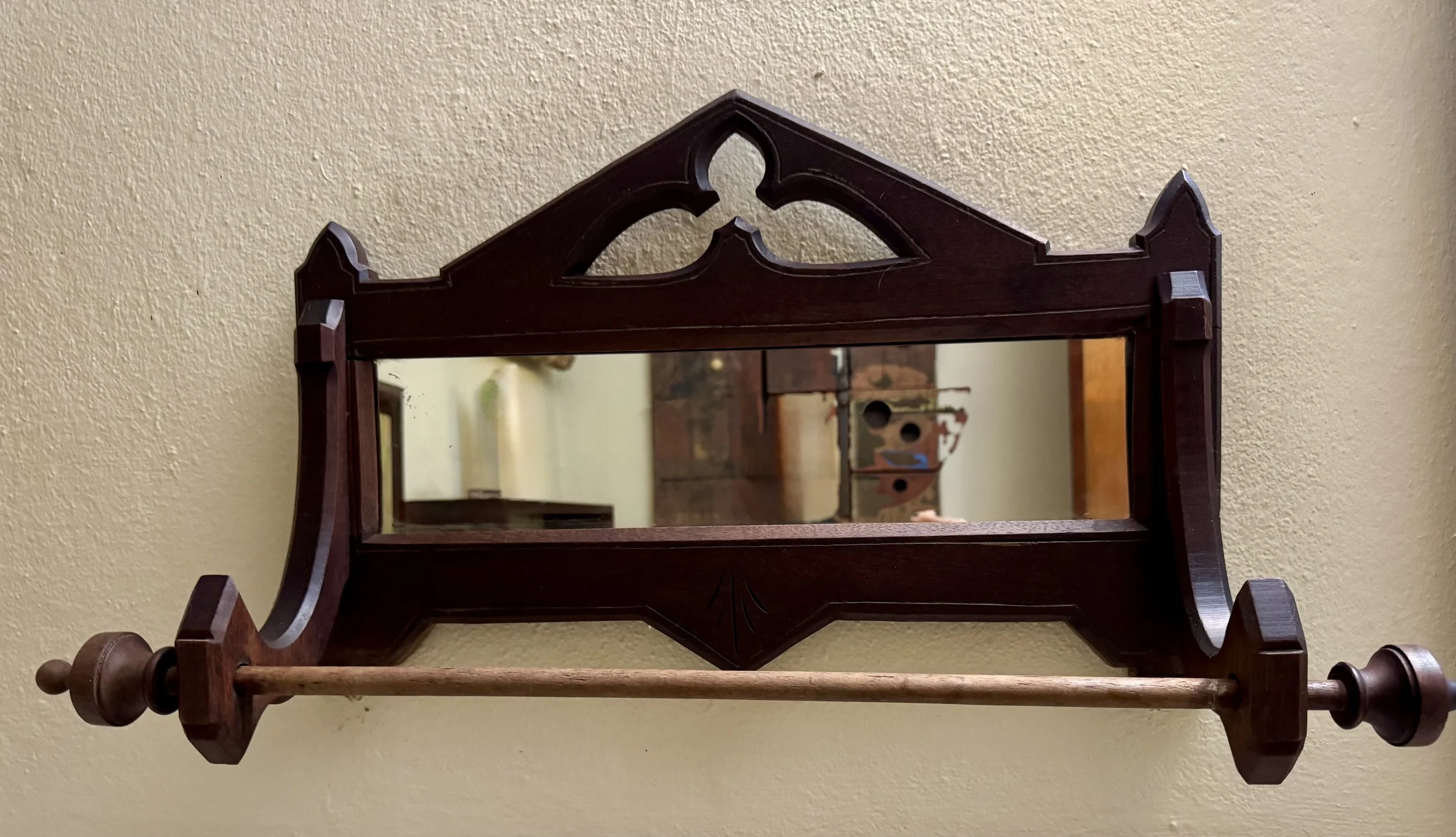 Antique Victorian natural wood wall-mounted shaving mirror with a drop-down towel rack. $75